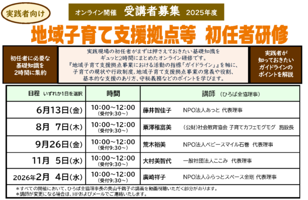 2025年度初任者研修申込受付中 申込受付中 2025-04-16 2025年度地域子育て支援拠点等 初任者研修お申込受付中です。 実践現場の初任者がまずは押さえておきたい基礎知識をギュッと2時間にまとめたオンライン研修です。『地域子育て支援拠点事業における活動の指標「ガイドライン」』を軸に、子育ての現状や行政制度、地域子育て支援拠点事業の意義や役割、基本的な支援のあり方、守秘義務などのポイントを初任者がオンラインで学べる機会を提供いたします。 詳細を見る