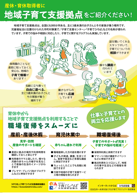 ひろば全協中期計画のテーマのひとつである「企業や行政をはじめとした多様な関係者とのつながりの強化」に基づき、子育てひろばを運営する皆さまが地域の企業等との連携にご活用いただくための広報チラシデータを下記のURLより提供いたします。